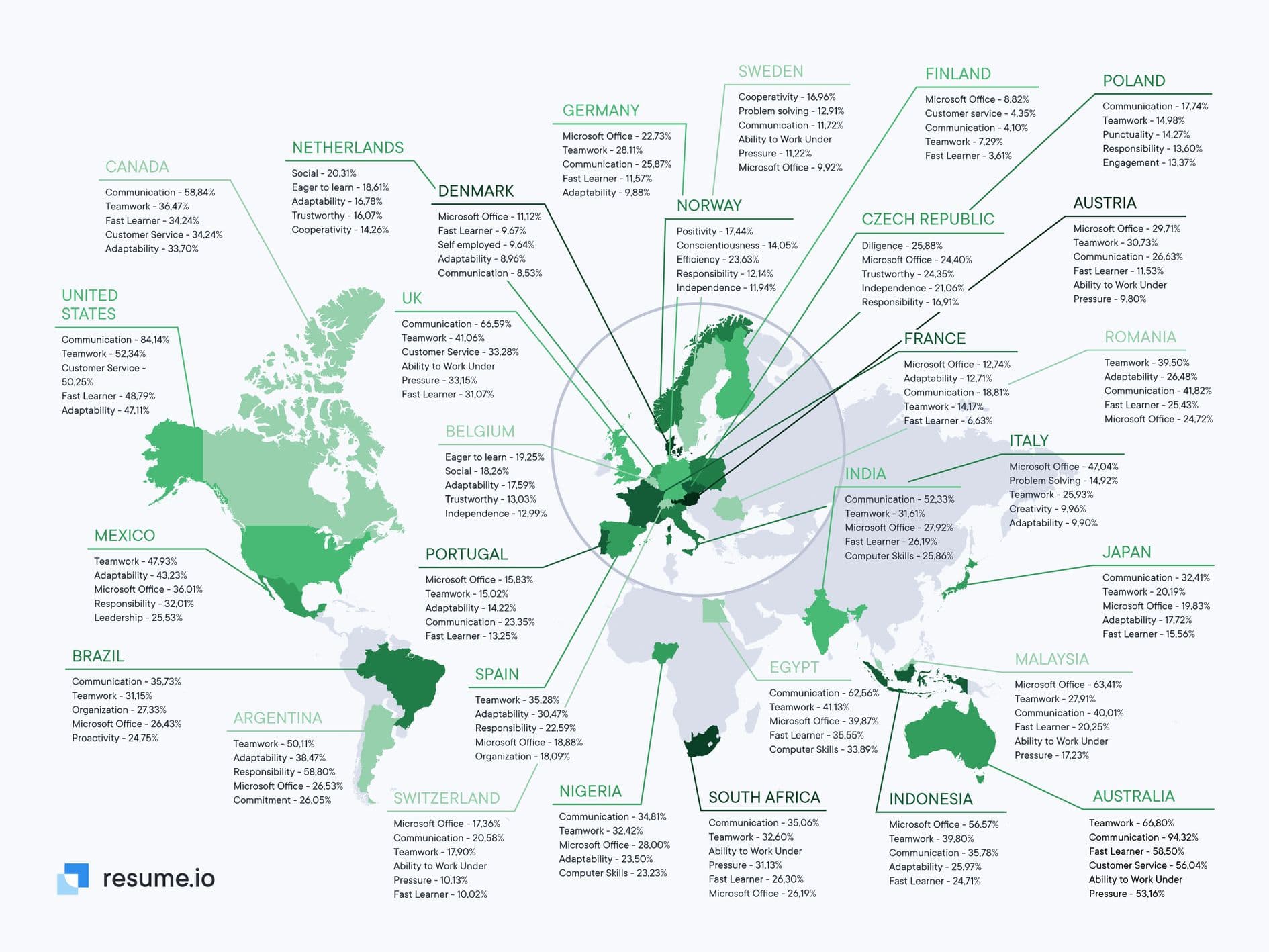 In several countries, more than half of all resumes mention this ability, some well above that percentage. In fact, in Australia, communication is everything with a whopping 94.3% of job applicants listing this ability on their resumes. The United States ranks second in this category, with 84.1%, followed by the UK with 66.5%; Egypt, 62.5%; Canada, 58.8%; and India, 52.3%.