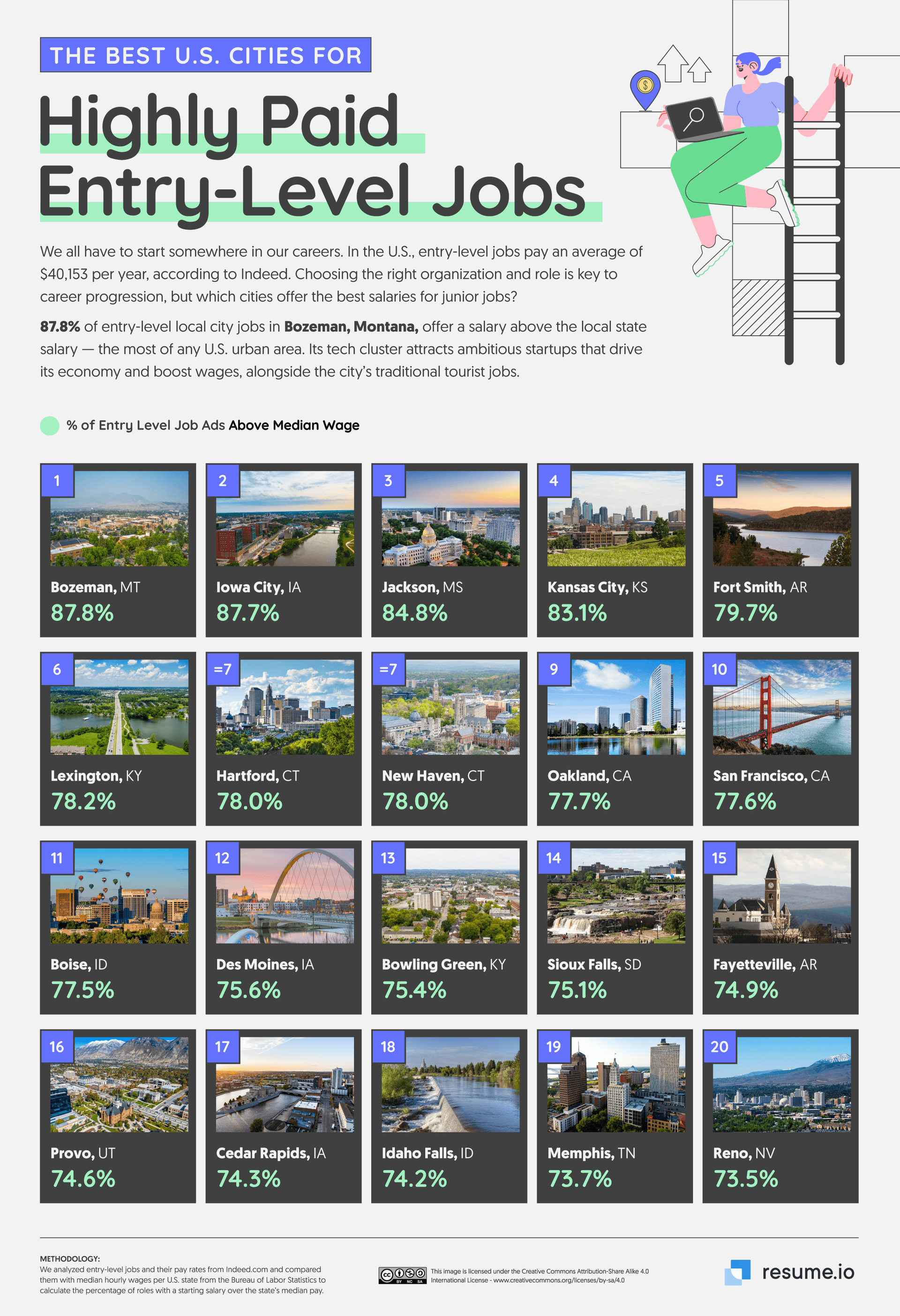 - 87.8% of entry-level job listings in Bozeman, Montana, offer a salary above the state’s median wage — more than any other U.S. city.