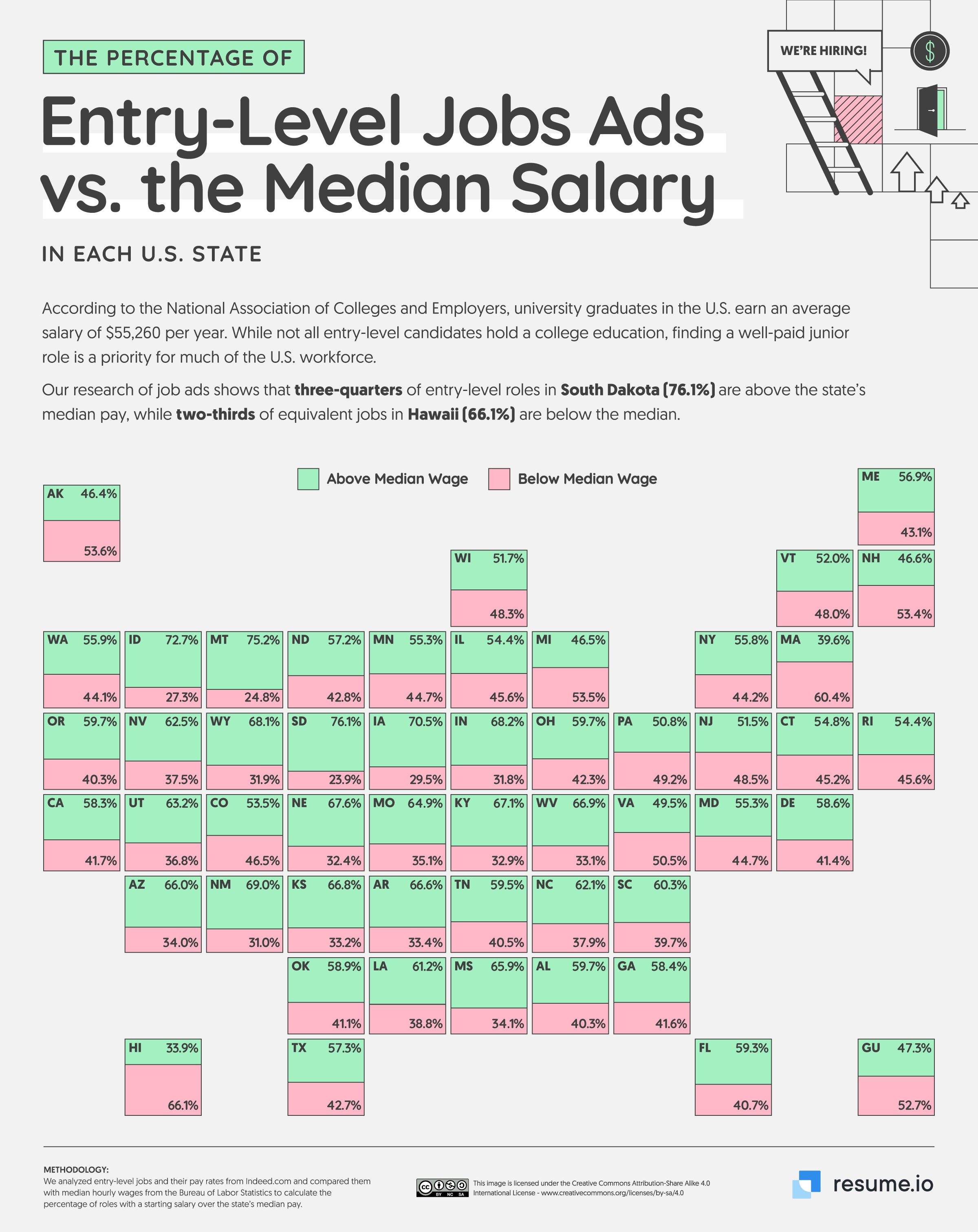 - South Dakota is the best state to find a high-paying entry-level job (76.1% of listings pay above the median wage).