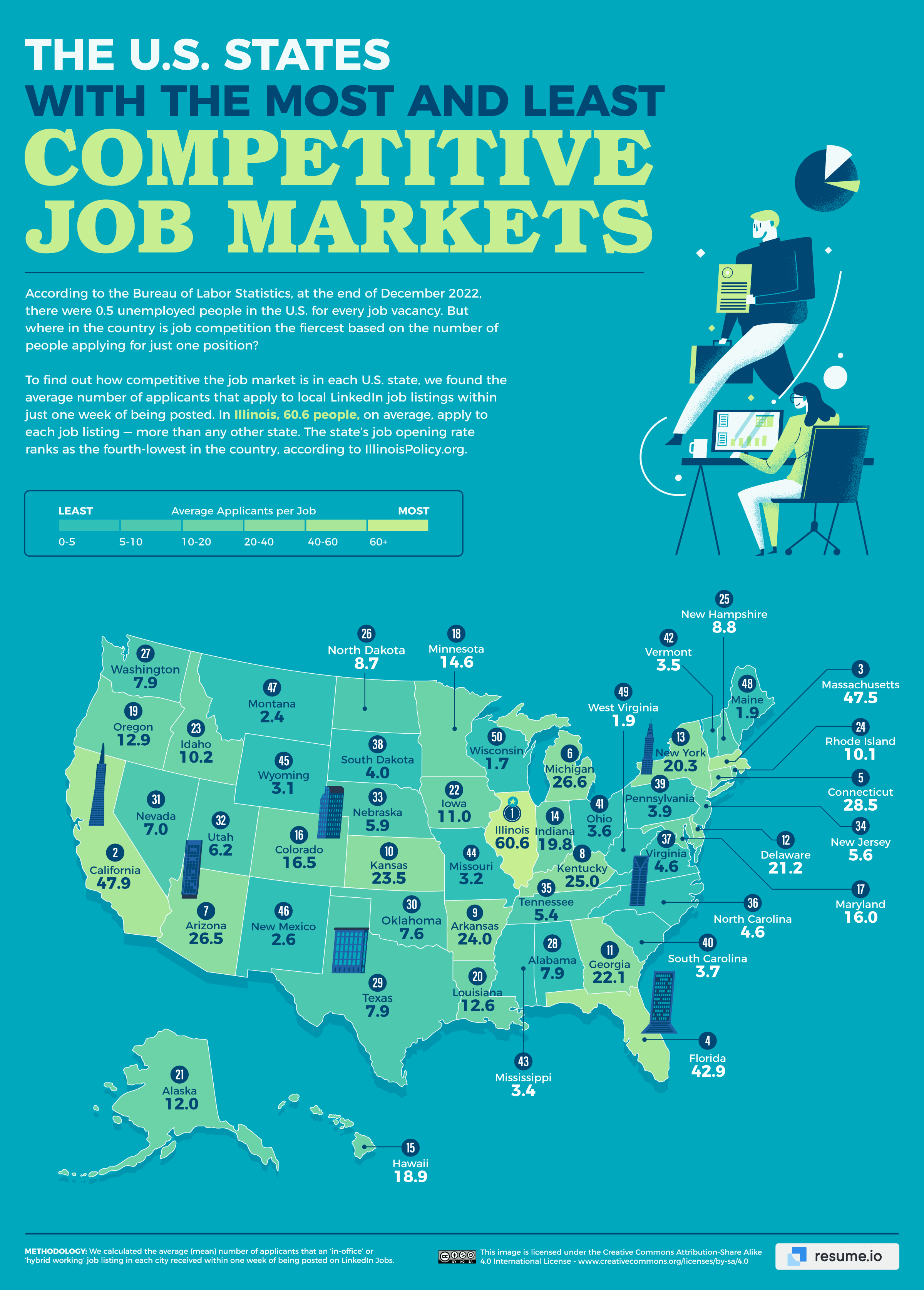 - Illinois has the most competitive job market of any U.S. state (60.6 applicants per job posting within one week), while San Jose, California, outranks all U.S. cities (107.6 applicants)