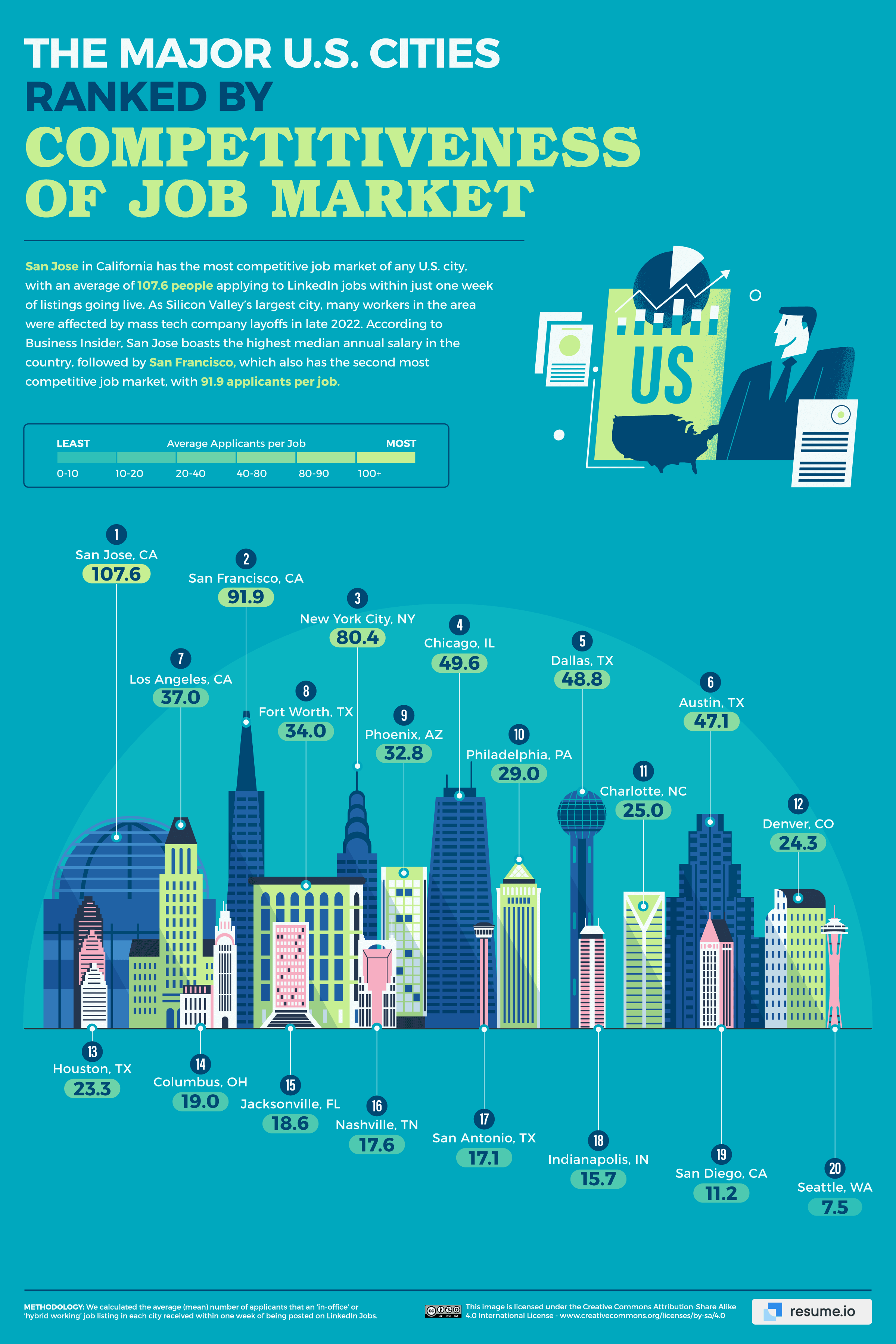 Focusing on U.S. cities, San Jose leads our ranking of the most competitive job markets in the country, with the average LinkedIn job posting here receiving 107.6 applicants within just a week.