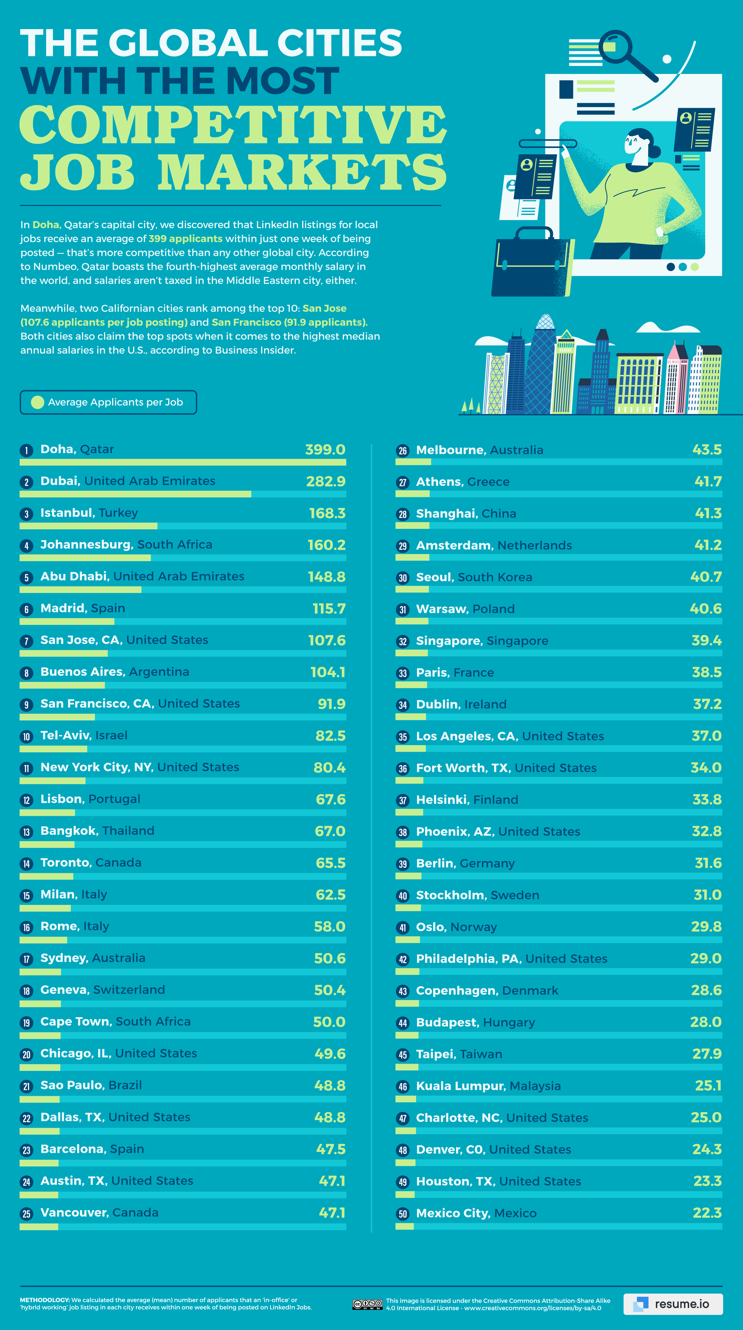- Doha, Qatar, has the most competitive job market in the world — within one week, 399 people, on average, apply for a LinkedIn job post