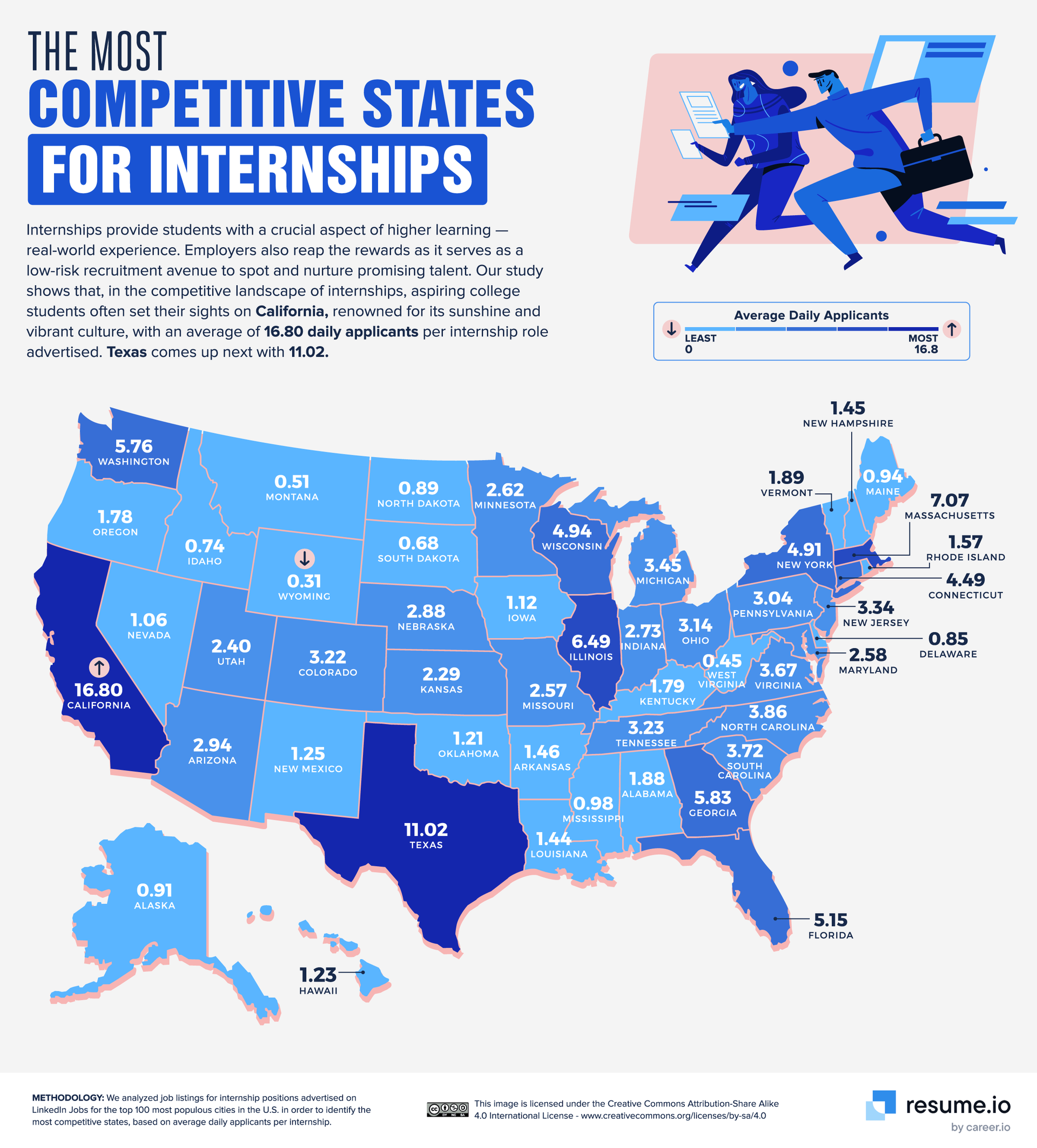 - Internship roles advertised in California attract 16.80 applicants per day — that’s more competitive than any other state.