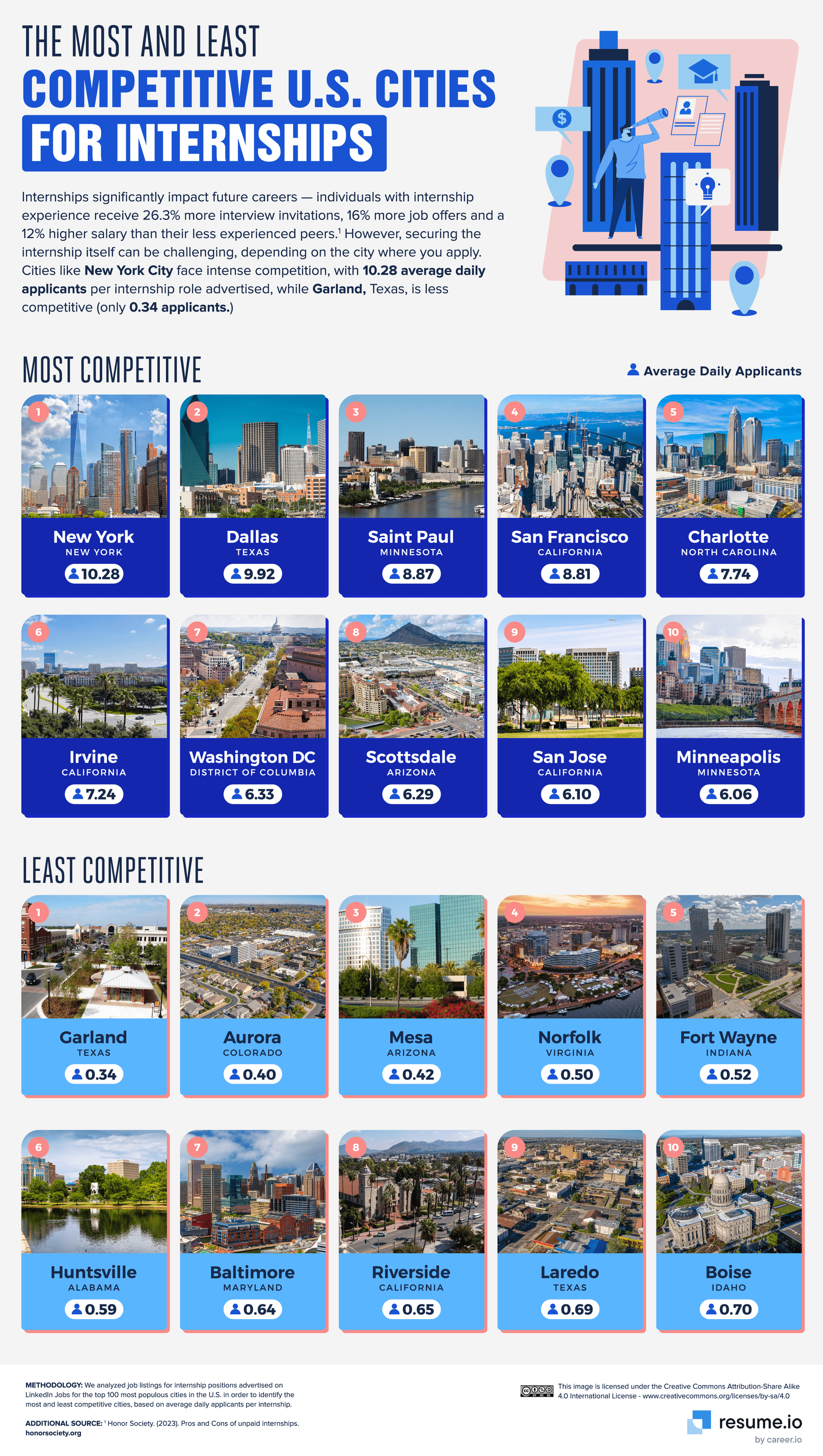 Meanwhile, would-be interns searching for opportunities in Texas — the second-most competitive state in which to land an internship — might consider heading to the city of Garland, where the average role receives just 0.34 applicants per day (fewer than any other city in the country). Here, the biggest local industry is services, encompassing businesses like hotels and health and legal services.