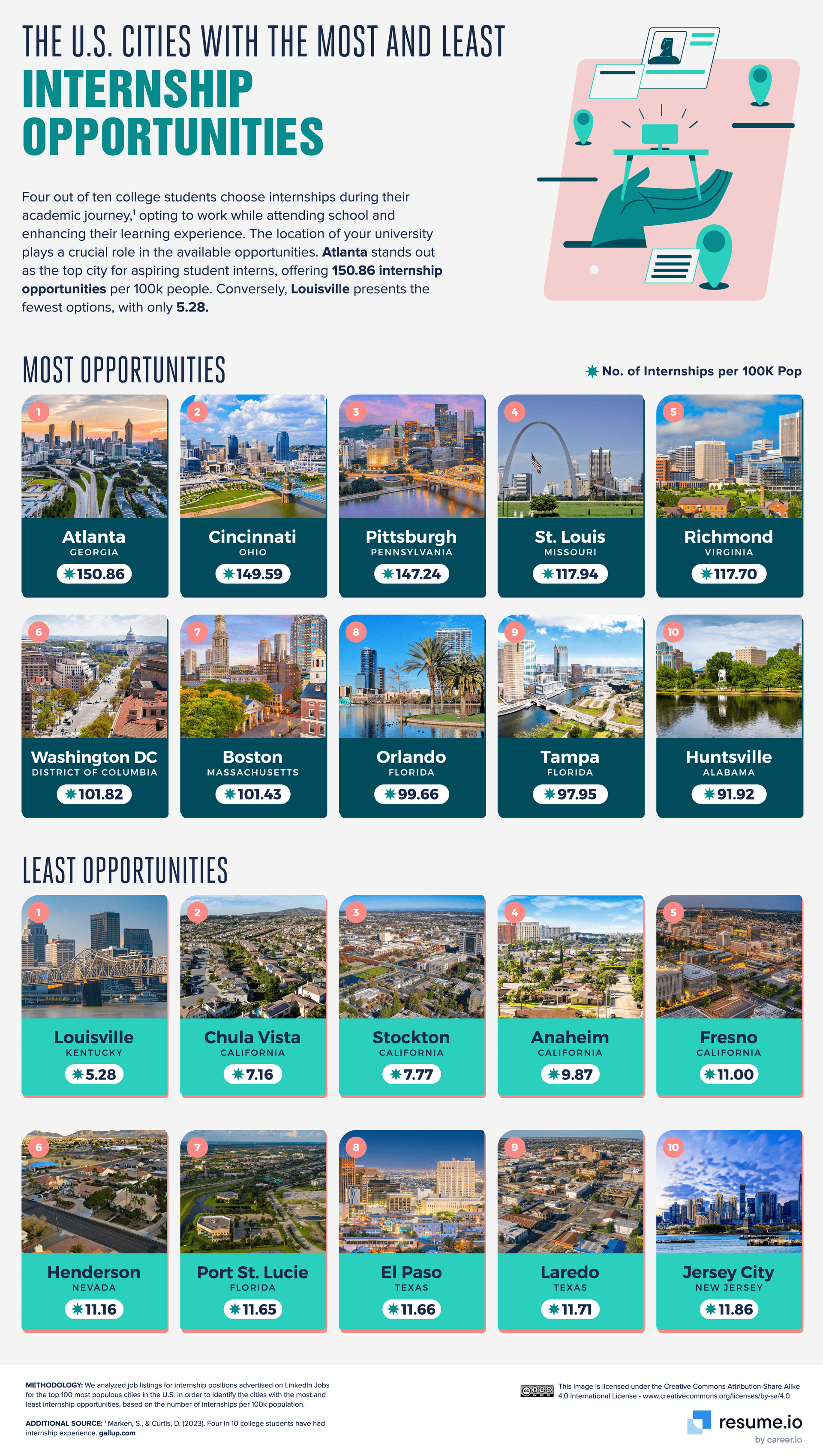 Other cities offer far fewer opportunities for budding interns. Louisville in Kentucky comes top in that respect, a city in which we found just 5.28 roles for 100,000 of the population. Interestingly, the next four cities are all in California (the most competitive state for internships), led by Chula Vista (7.16 roles), named by WalletHub as one of the worst cities in the country in which to start a career.