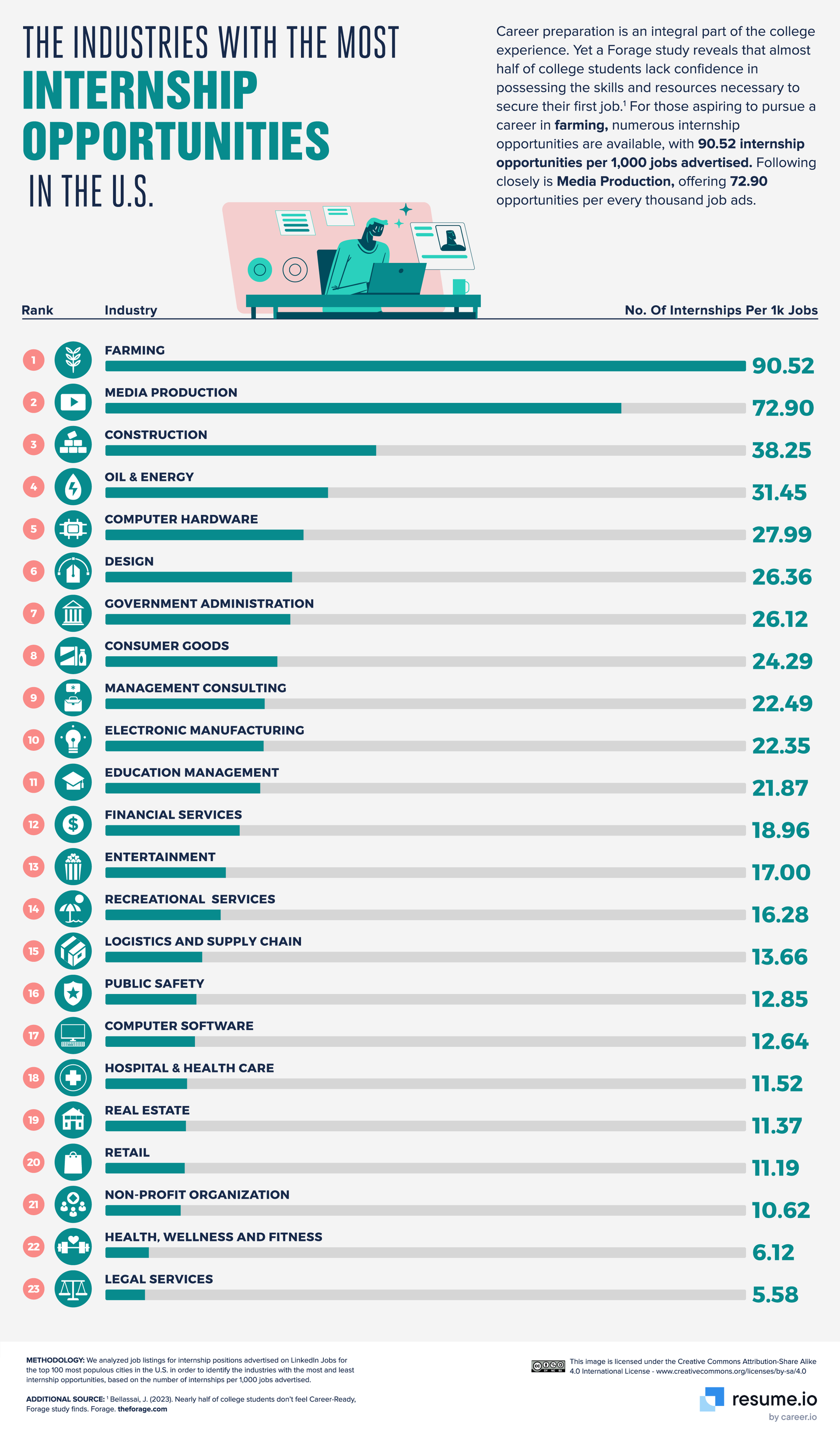 In contrast, farming ranks as the top industry for available internships; we uncovered 90.52 positions per 1,000 jobs on LinkedIn. Interns within this industry can, unfortunately, be seen as a cheap labor resource. “Small farmers sometimes maintain that they seek to hire so-called apprentices and interns because they can’t afford skilled workers,” writes Lela Nargi of Ambrook Research. “And that they don’t have the time, energy, or resources to teach them formally.”