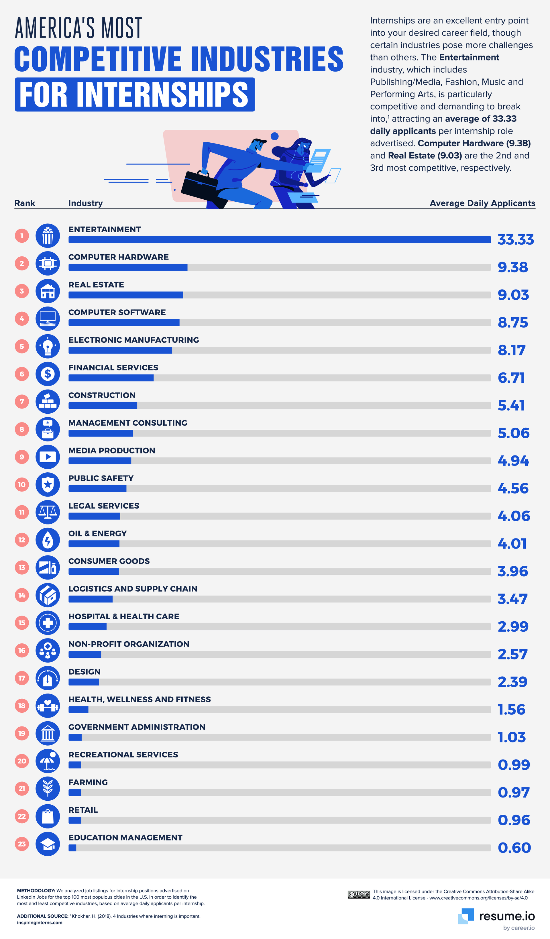 - Entertainment ranks as the most competitive industry for interns, with the average internship role attracting 33.33 daily applicants.